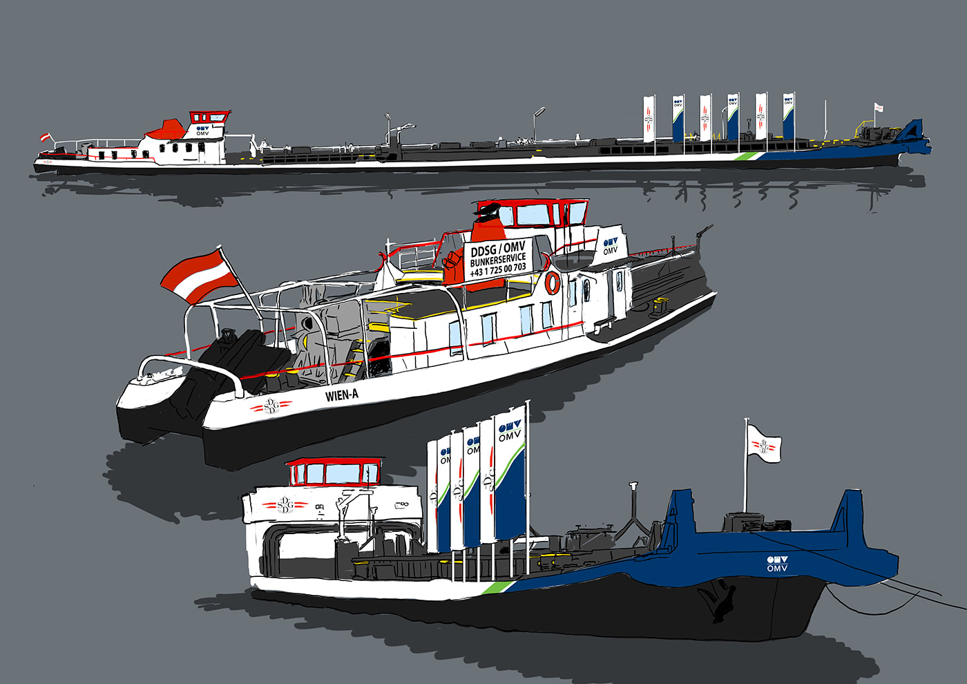 Das österreichische Frachtschifffahrtsunternehmen DDSG betreibt in Kooperation mit dem Ölkonzern OMV eine schwimmende Tankstelle auf der Donau in Wien. Diese Illustrationen waren die Vorlage für die farbliche Neugestaltung der fixen und der beweglichen Bunkerstationen, bevor sich das Unternehmen entschied, ein Logo-Redesign bei uns in Auftrag zu geben.
